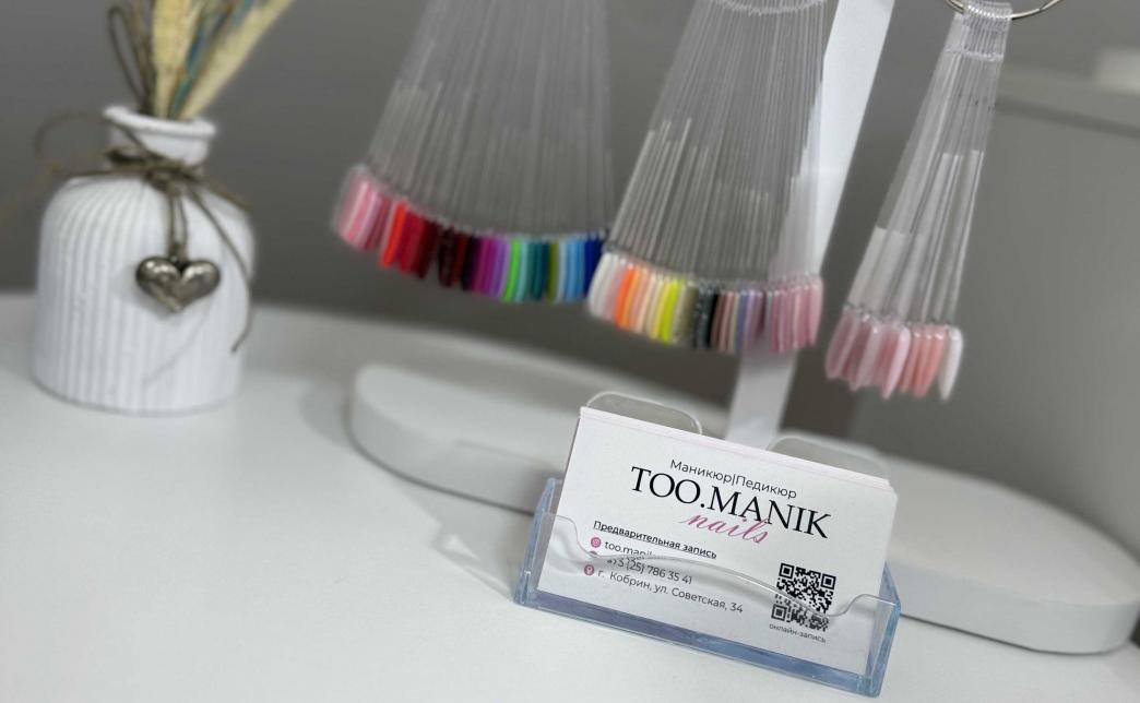 - Промокод дает право на скидку 20% на маникюр, педикюр в студии "Too.manik" в Кобрине