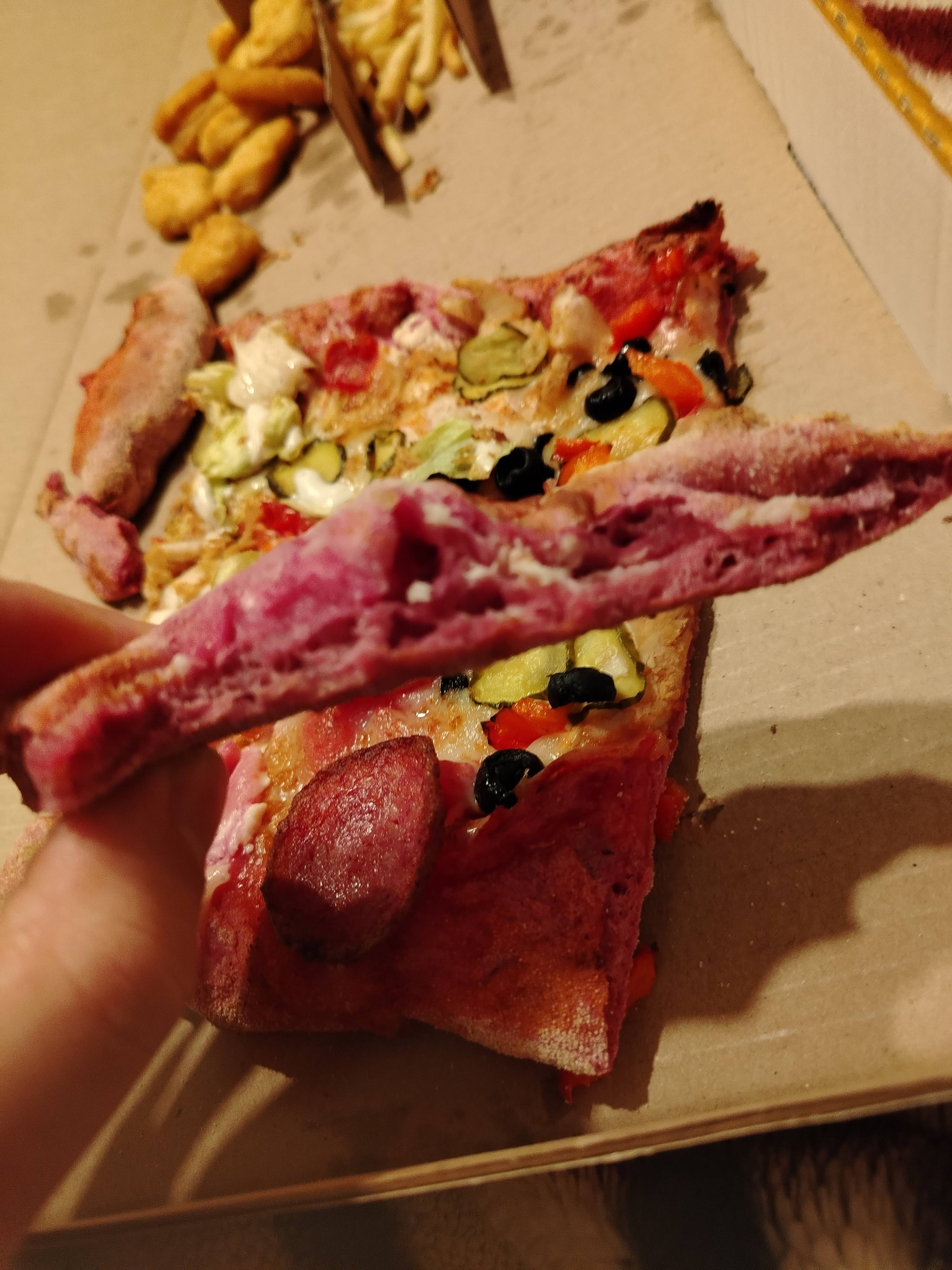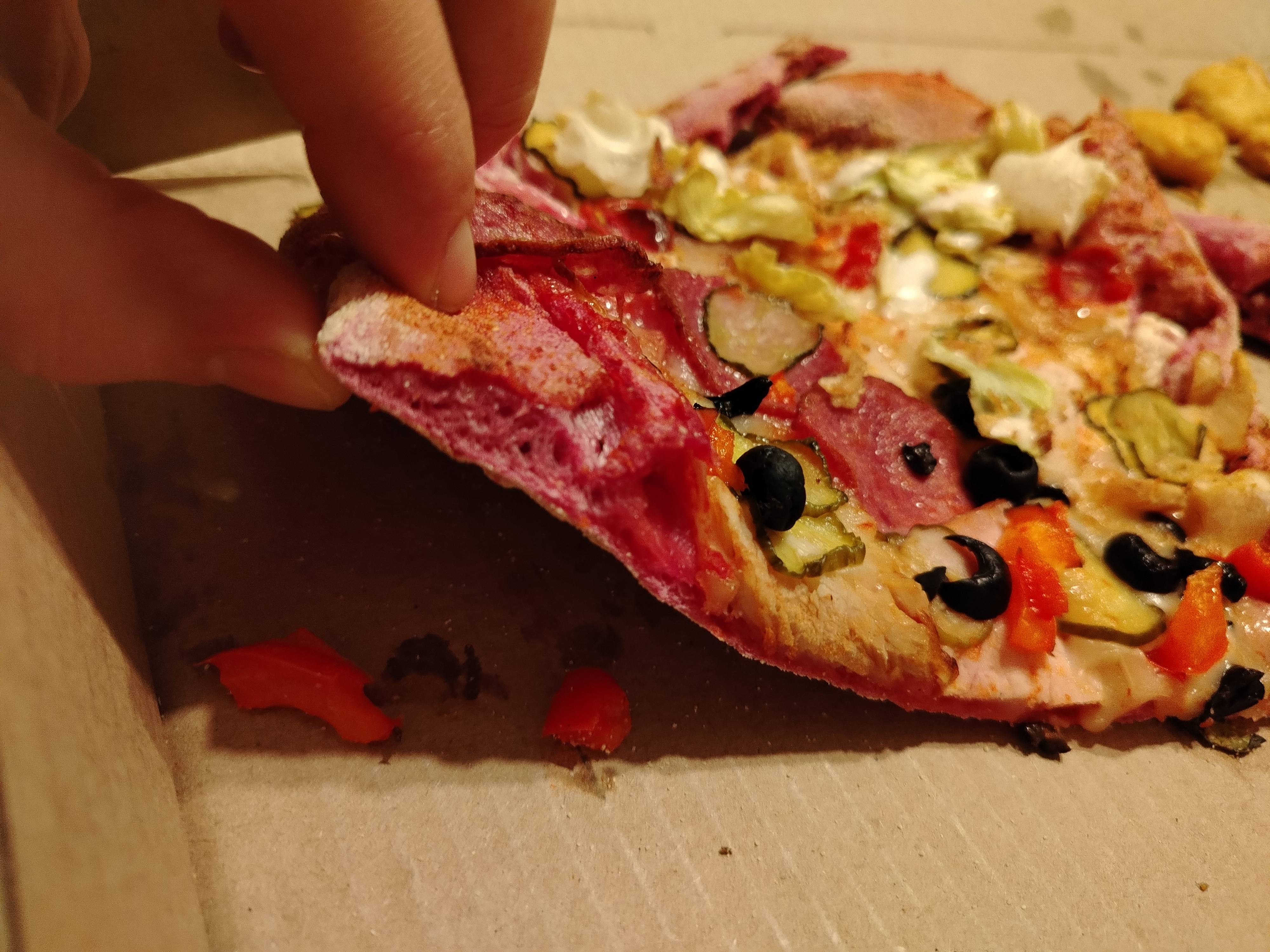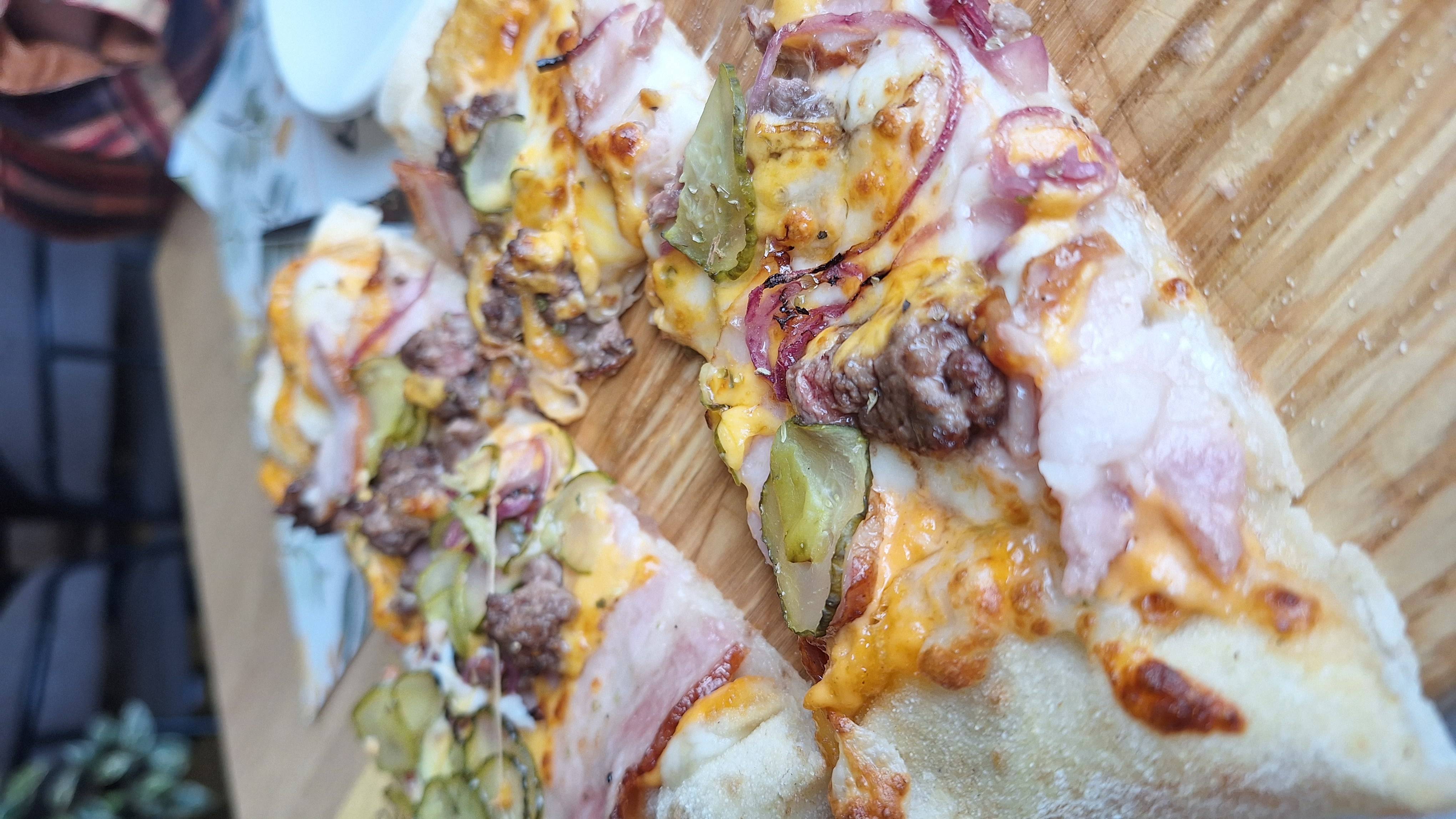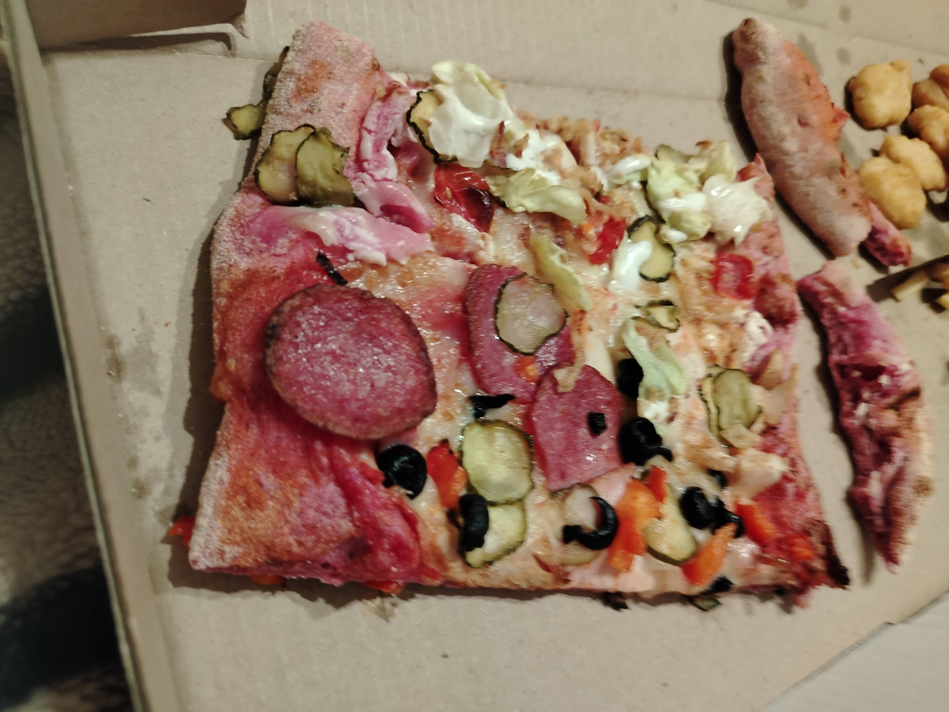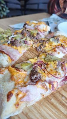 - половина пиццы "Фаторина": томатный соус, моцарелла, копченый бекон, охотничьи колбаски, огурец маринованный, соусом горчичный, лук порей, лук фри