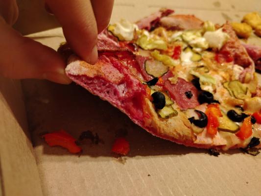 - половина пиццы "Капричезе": соус томатный, моцарелла, маслины, шампиньоны, черри, ветчина