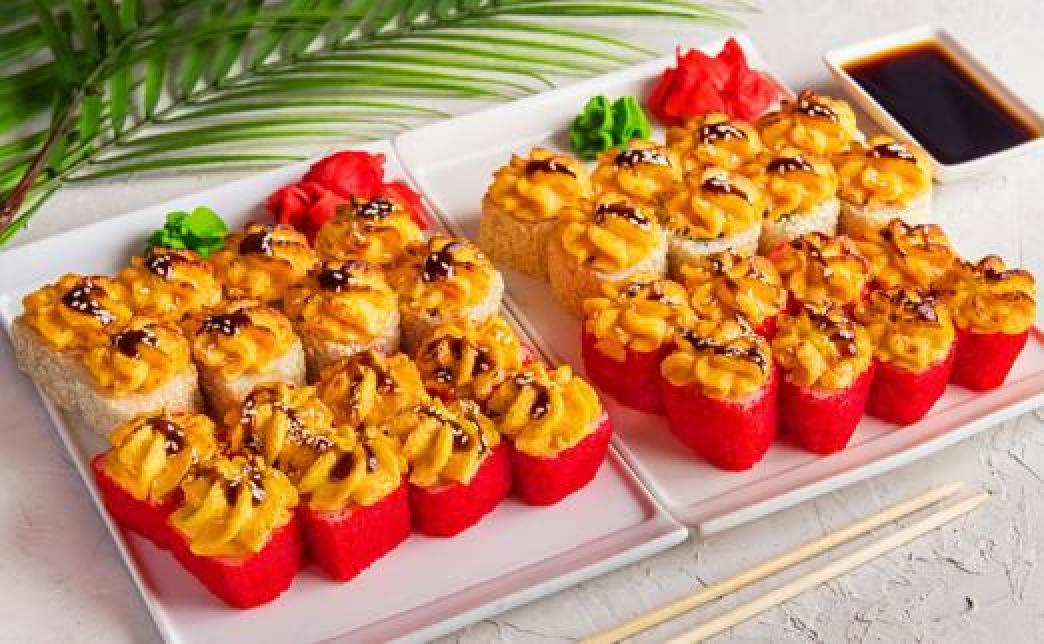 - суши "Гриль лосось" (2 шт): лосось, сливочный сыр, огурец, соус для запекания